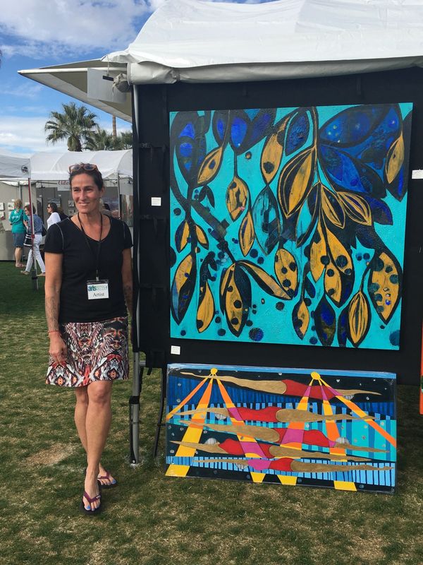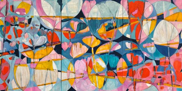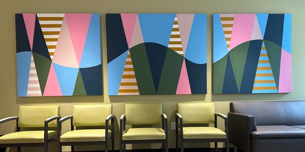 Equally colorful and layered as my textile work, my mixed media paintings harness details inspired by nature. Incorporating gestural lines and repeated patterns, these layered works capture and explore the balance of organic imagery with geometric shapes and forms. Multiple layers of paint add to the surface texture of the canvases. I am intrigued with the negative spaces that emerge as a painting develops and the spatial transparency that is created. I am fond of abstract imagery, which are depicted in these visual narratives. Incorporating concepts of scale, space, rhythm and movement lend to the perspective of each piece. There is a reliance on repeated patterns, gestural lines, and grids. Patterns that exist in nature, intertwine with personal stories to inspire the compositions. I began stitching certain paintings by hand-sewing nylon thread directly into the canvas. This subtle pattern of fiber adds texture and fine detail.
